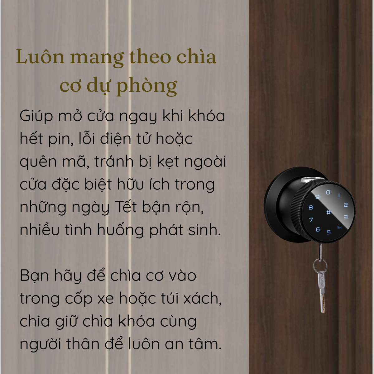 Dù Smartlock mang lại sự tiện lợi và hiện đại, chìa cơ dự phòng vẫn đóng vai trò là phương án an toàn không thể thiếu, đặc biệt trong những ngày Tết bận rộn. Chìa cơ giúp người dùng có thể mở cửa ngay khi khóa hết pin, gặp lỗi điện tử hoặc trong trường hợp quên mã, tránh tình trạng bị kẹt ngoài cửa khi đang cần ra vào gấp.